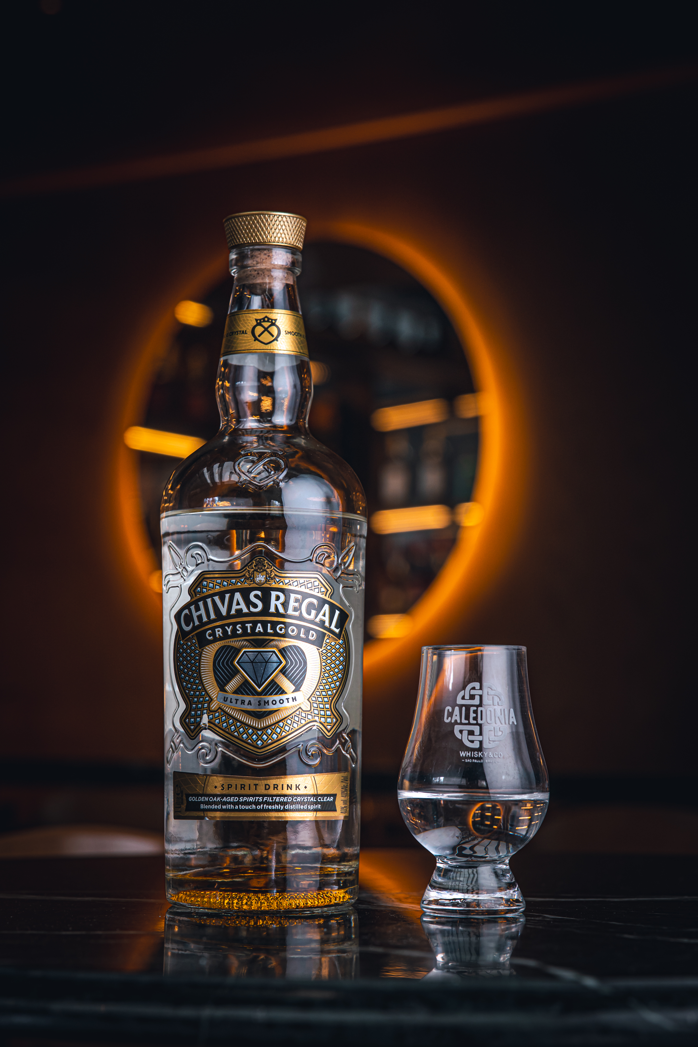 A ciência por trás da criação do Chivas Regal Crystalgold é, no mínimo, engenhosa. A maior parte dele é um blend próprio, criado por Sandy Hyslop, master blender da Chivas. Esse blend matura por um tempo não divulgado em barris de carvalho – extra-oficialmente, fala-se de três a doze anos – especialmente first-fill ex-bourbon. Este whisky passa então por um filtro especial de carvão, que remove sua coloração, e o new-make é adicionado.